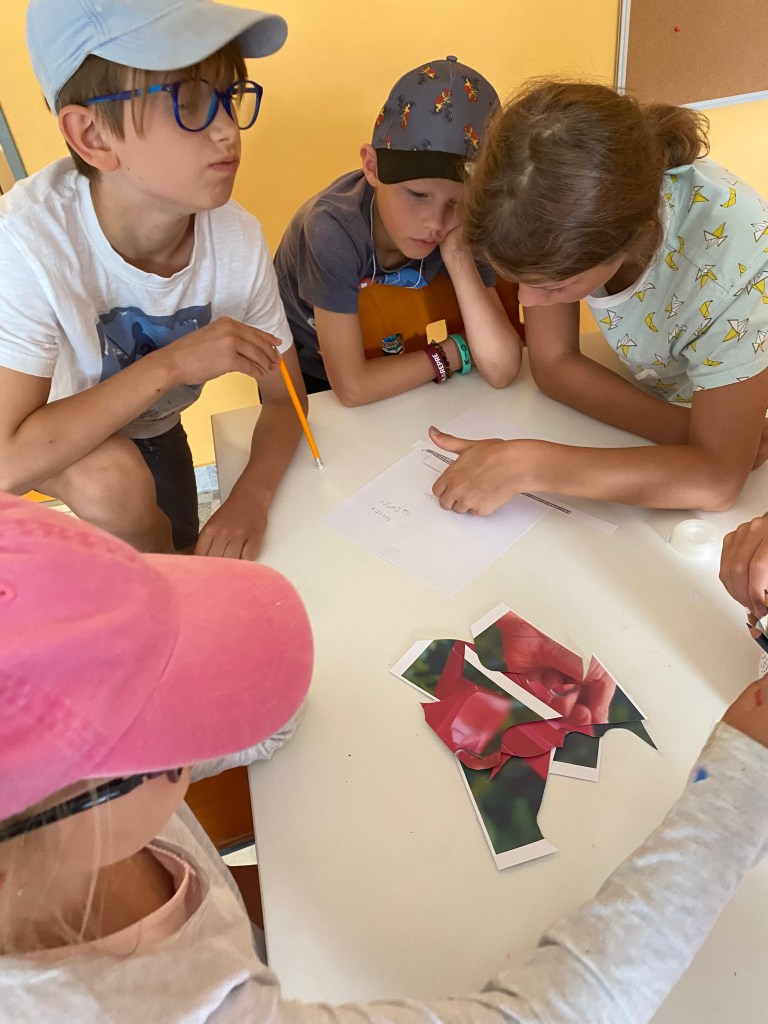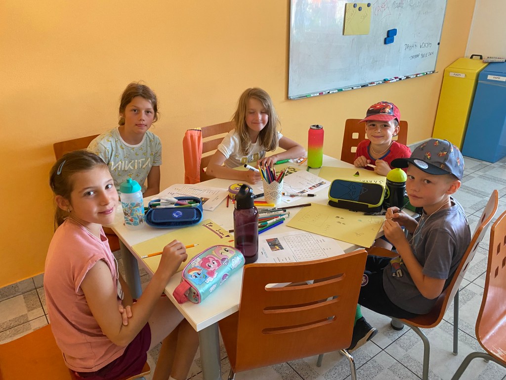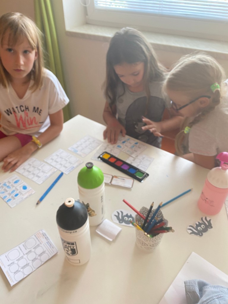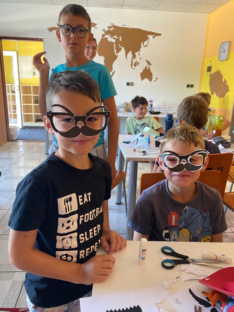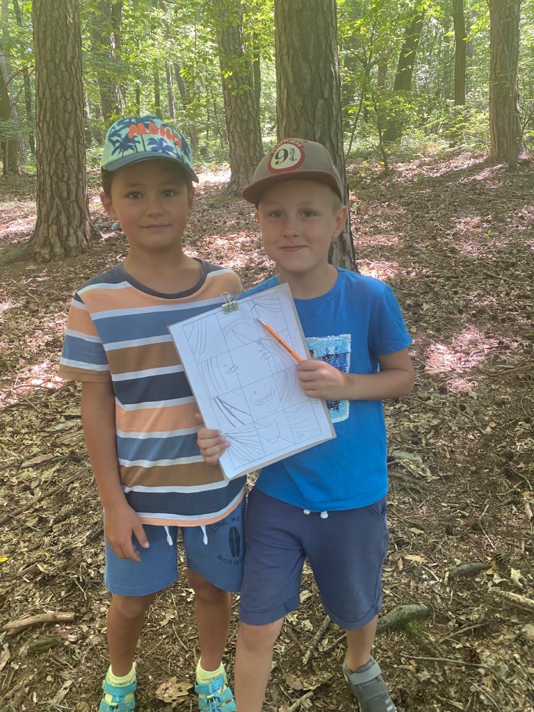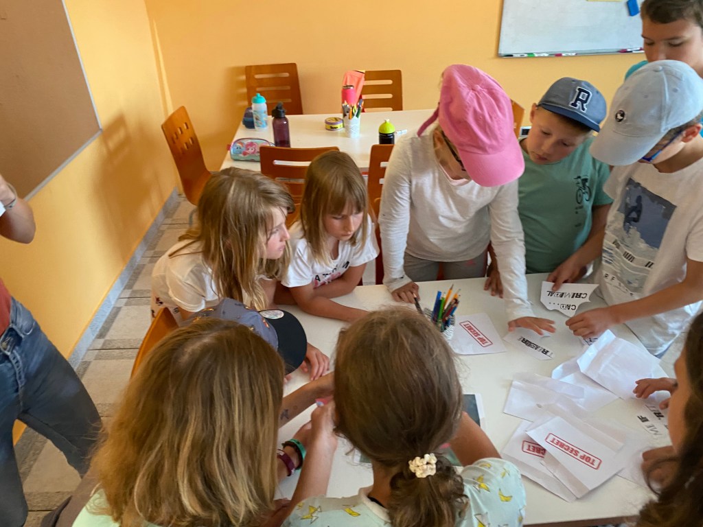 V tomto týdnu jsme trávili spoustu času venku a malí detektivové procvičovali své badatelské dovednosti, fyzickou zdatnost, ale i důvtip při týmových hrách a individuálních disciplínách. Nakreslit portrét podezřelého, sejmout otisky prstů, či vyrobit si převlek, který ošálí každého pachatele? Žádný problém! Uprostřed týdne se naši detektivové úspěšně dostali z únikové místnosti, a během celého tábora luštili tajné kódy a rébusy, které je přivedli na stopu tajného pachatele, který hned na začátku týdne ukradl všechny sladkosti! Naši malí detektivové pachatele, který si říkal Secret Criminal, však vypátrali a úspěch oslavili v bazénu 🙂